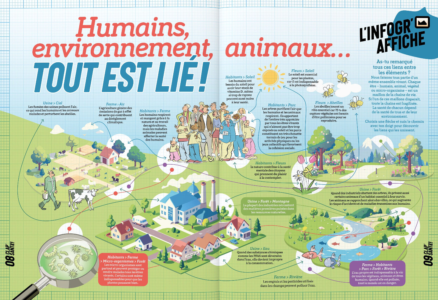 As-tu remarqué tous ces liens entre les éléments ? Nous faisons tous partie d'un même ensemble vivant. Chaque être-humain, animal, végétal ou micro-organisme - est un maillon de la chaîne de vie. Si l'un de ces maillons disparaît, toute la chaîne est fragilisée. La santé de chacun dépend de la santé de tous et de leur environnement.
